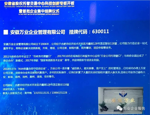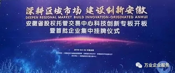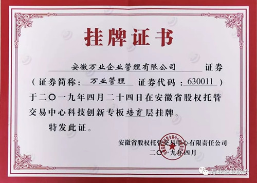 2019年4月24日這一天,安徽萬業(yè)企業(yè)管理有限公司成功入駐安徽省股交中心首批科創(chuàng)板企業(yè),掛牌證券代碼:630011,這是值得被紀念的一天,是一個新的歷史上的里程碑!