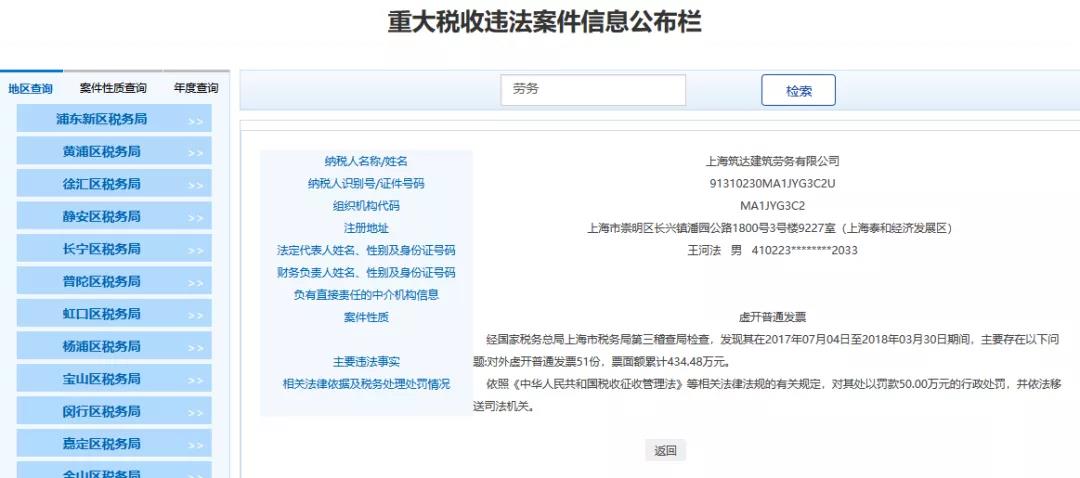 2、上海XX建筑勞務有限公司,經(jīng)國家稅務總局上海市稅務局第三稽查局檢查,發(fā)現(xiàn)其在2017年07月04日至2018年03月30日期間,主要存在以下問題:對外虛開普通發(fā)票51份,票面額累計434.48萬元。依照《中華人民共和國稅收征收管理法》等相關法律法規(guī)的有關規(guī)定,對其處以罰款50.00萬元的行政處罰,并依法移送司法機關。