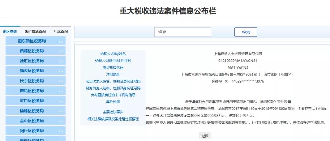 5、上海XX人力資源管理有限公司,經(jīng)國家稅務總局上海市稅務局第二稽查局檢查,發(fā)現(xiàn)其在2017年06月19日至2018年09月30日期間,主要存在以下問題:對外虛開增值稅銷項發(fā)票100份,金額996.98萬元,稅額169.49萬元。依照《中華人民共和國稅收征收管理法》等相關法律法規(guī)的有關規(guī)定,已作出稅務行政處理決定,并依法移送司法機關。
