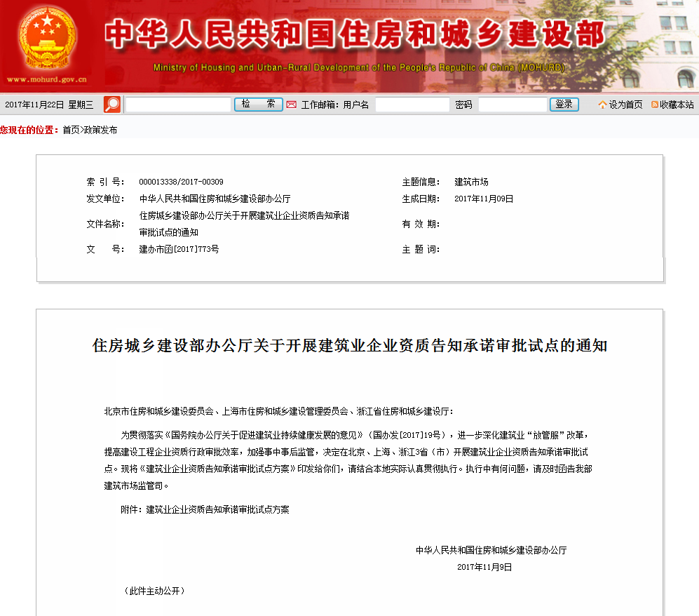 按照地方自愿原則,確定以建設(shè)工程企業(yè)較多、市場監(jiān)管水平較高、電子化資質(zhì)審批成效明顯的北京市、上海市、浙江省作為試點(diǎn)地區(qū),對(duì)工商注冊(cè)地為試點(diǎn)地區(qū)的建筑工程、市政公用工程施工總承包一級(jí)資質(zhì)開展告知承諾審批試點(diǎn)。
